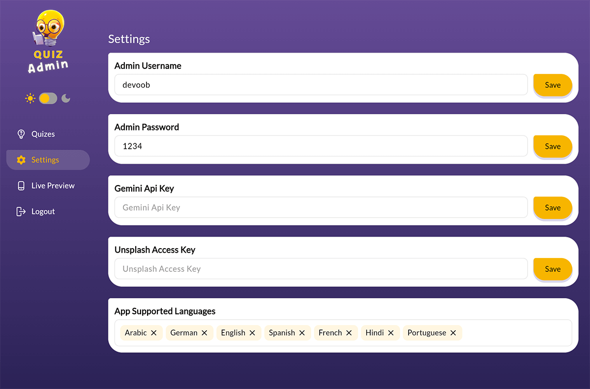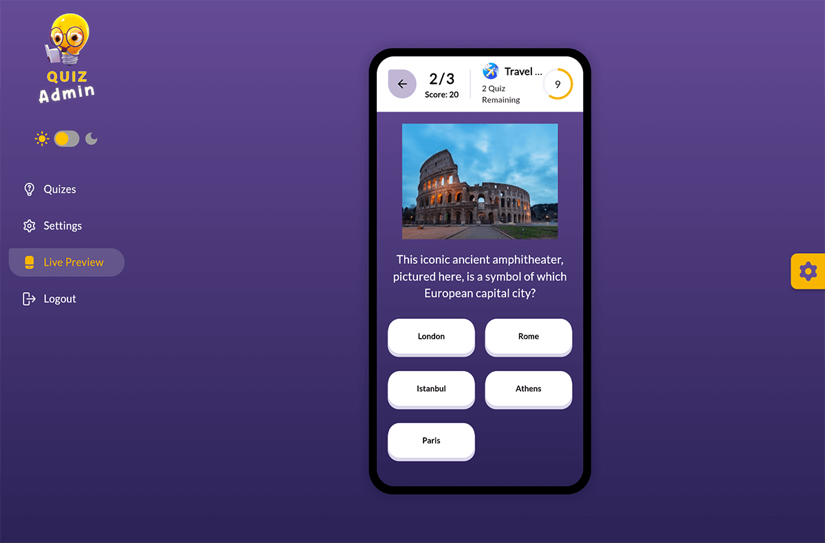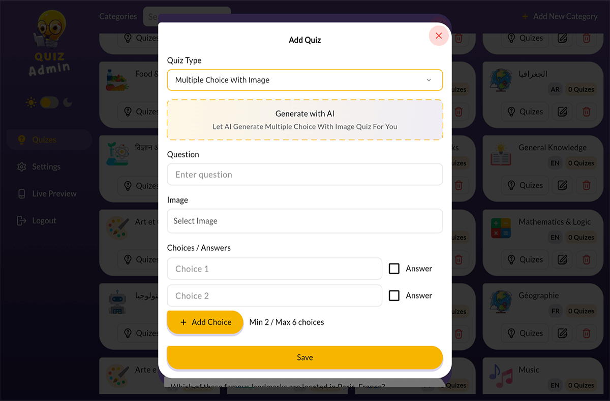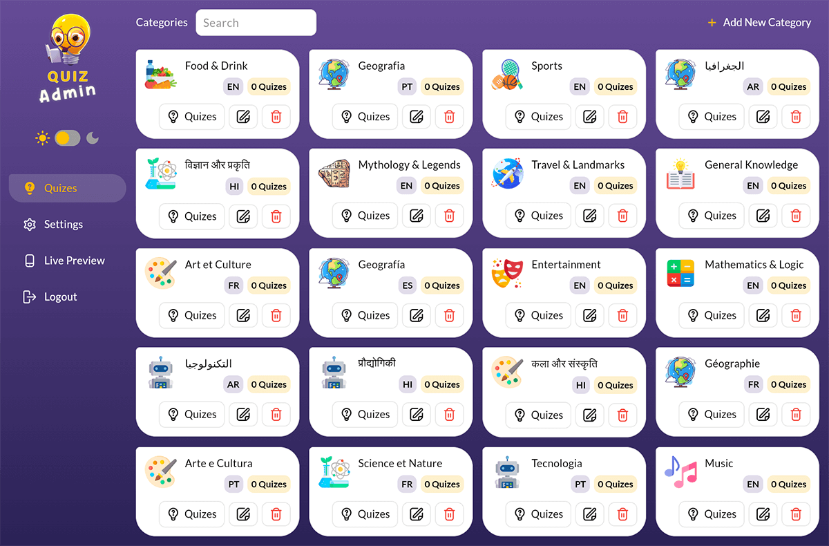 Easily manage quizzes, categories, and users with an intuitive admin interface.
